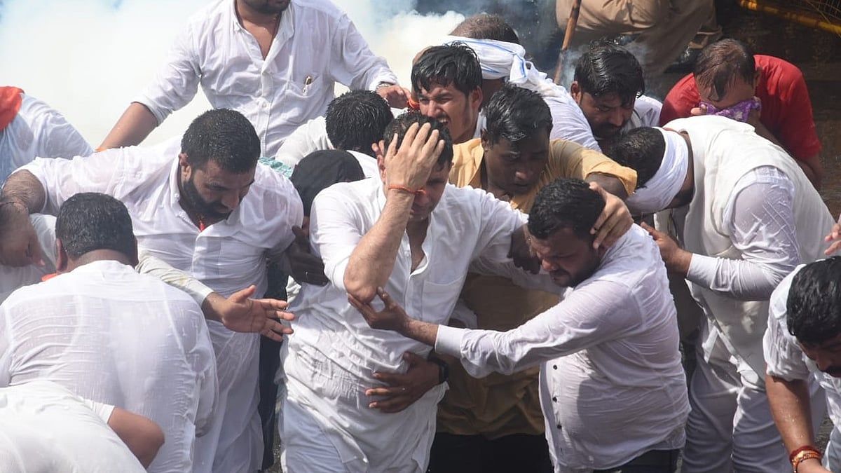 Congress President Jitu Patwari sustains injuries as police force aggressively direct water canons towards him. Patwari was trying to crying the barricades when the cops targeted him and shoot the water gushing at a high speed.