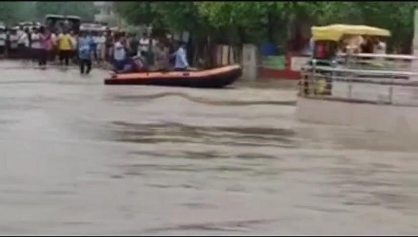 Sheopur (Madhya Pradesh): Continuous rain for the past 24 hours has created flood-like conditions in Sheopur district's Baroda Nagar. Streets, homes, shops, and even the police station are submerged. The connection to Kota and Baran in Rajasthan has been cut off. People are taking shelter on rooftops for safety.