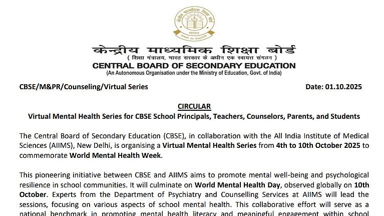 CBSE, in collaboration with AIIMS, will host a Virtual Mental Health Series from Oct 4–10, 2025. Sessions aim to raise awareness, reduce stigma, and promote well-being in schools.