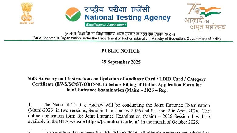 The National Testing Agency (NTA) has issued an advisory for JEE Main 2026 aspirants, urging them to update Aadhaar, UDID, and category certificates before registration. Applications for Session 1 open in October 2025.