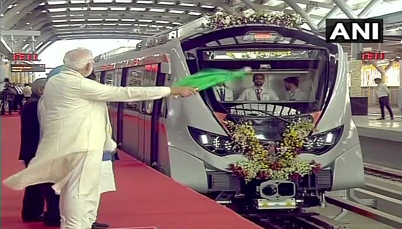 Ahmedabad: Prime Minister Narendra Modi Monday inaugurated a 6.5-km stretch of phase one of the Ahmedabad Metro train service here. After inaugurating the 6.5 km stretch, connecting Vastral to Apparel park area here, Modi also took a ride on the metro. Modi reached Vastral Gam metro station and inaugurated the first phase by unveiling a plaque and waving a green flag to the metro train and travelled in it for a short distance.