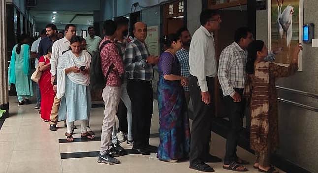 Employees of all government departments appeared in the office at the time prescribed by the government and registered their thumb impression. But due to the installation of shorter number of machines in comparison to the need, long queues were seen. In the morning, employees were seen puzzled to enrol their details in the machine. Many of them could not register their attendance in the machine. Same situation was seen in the evening also.