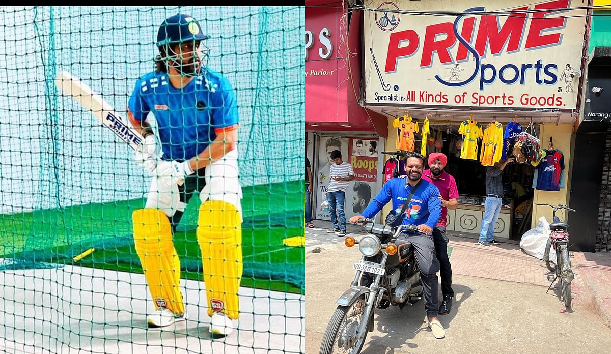 A couple of pictures of Dhoni practicing with the Prime Sports-stickered bat, linking back to Paramjit's shop in Ranchi, is gaining attention on social media.