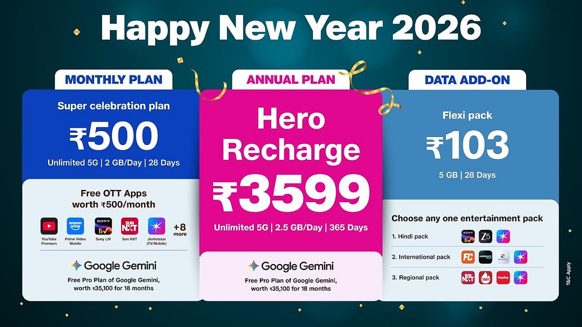 Reliance Jio, India’s largest telecommunications provider with over 450 million subscribers, has launched its new Happy New Year 2026 recharge plans in India. The plans are priced at Rs. 103, Rs. 500, and Rs. 3,599. They bring different benefits, but all of them include unlimited calling benefits. The plans are available for recharge immediately through the MyJio app, Jio website, and authorised retail outlets.