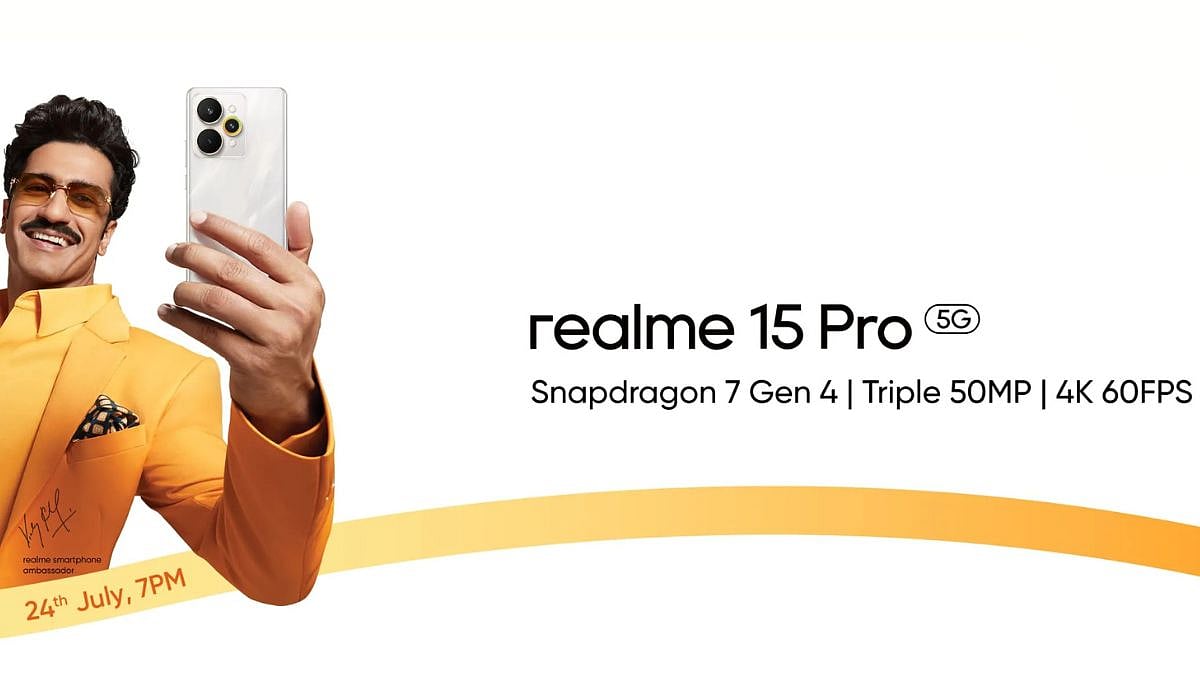 Realme 15 Pro 5G launches in India on July 24 alongside Realme 15 5G. It features a 50-megapixel Sony IMX896 camera with OIS, 4K 60fps video, and AI MagicGlow 2.0. Specs include a Snapdragon 7 Gen 4 chip, a 7,000mAh battery with 80W charging, a 144Hz 4D curved display, an IP69 rating, and GT Boost 3.0. Available via Flipkart and Realme stores.