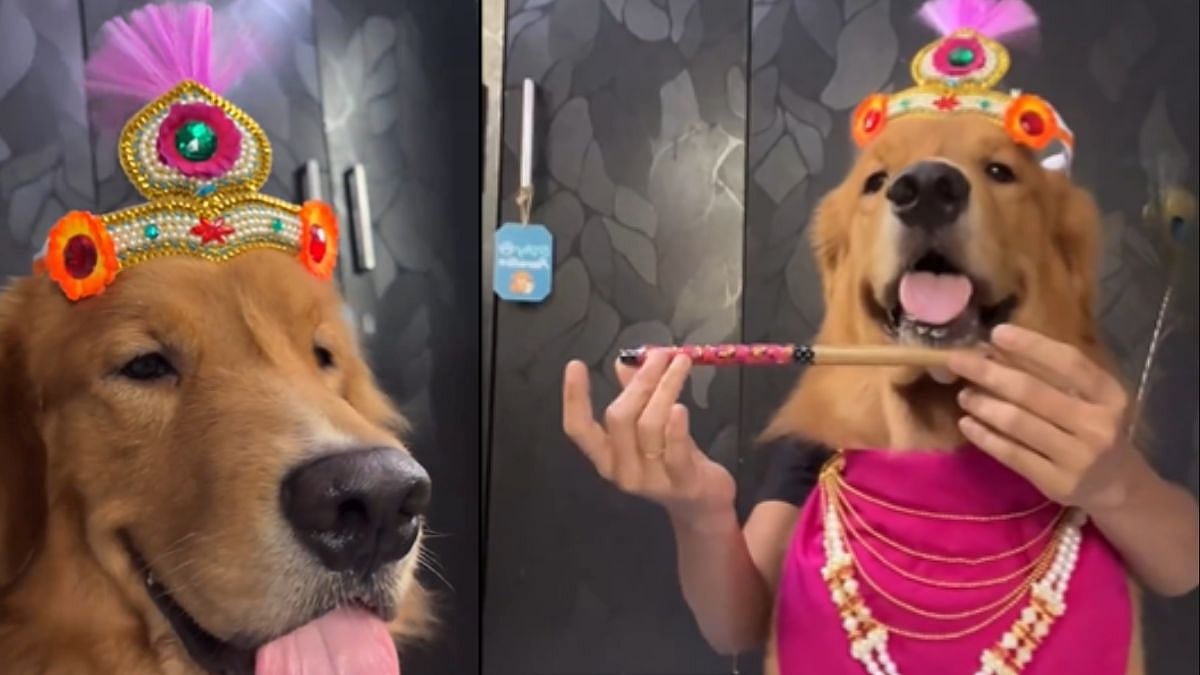 On the occasion of Krishna Janmashtami, pet parent from styled his golden retriever to resemble Lord Krishna. He dressed the doggo with an adorable pink scarf and a couple of hand and neck accessories. With a fancy head crown and a necklace, he made 'Joy' pose for camera in a Krishna Kanhaiya look. Hiding himself behind his pet, he held a flute to complete the look. As the video of the doggo dressed as Lord Krishna was uploaded online, it caught the attention of internet users and gathered mixed reactions. While a few people found the idea to be cute, others didn't find it okay to make a dog dress up like the Almighty.