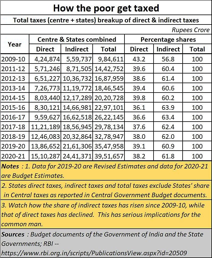To understand this, just look at the table alongside (a fuller version of this table can be downloaded from here). As RBI data shows, the share of direct taxes has been going down since 2009-10. In that year, direct taxes accounted for 43.2% of the tax basket, and indirect taxes 56.8%. Burt since then, successive governments opted to rely more on indirect taxes making them account for almost 62% of all taxes.