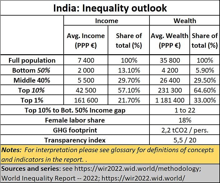 As the World Inequality Report puts it, “The average national income of the Indian adult population is €-PPP 7,400 (or INR 204,200). While the bottom 50% earns €-PPP2 000 (INR53,610), the top 10% earns more than 20 times more (€-PPP42 500 or INR 1,166,520).