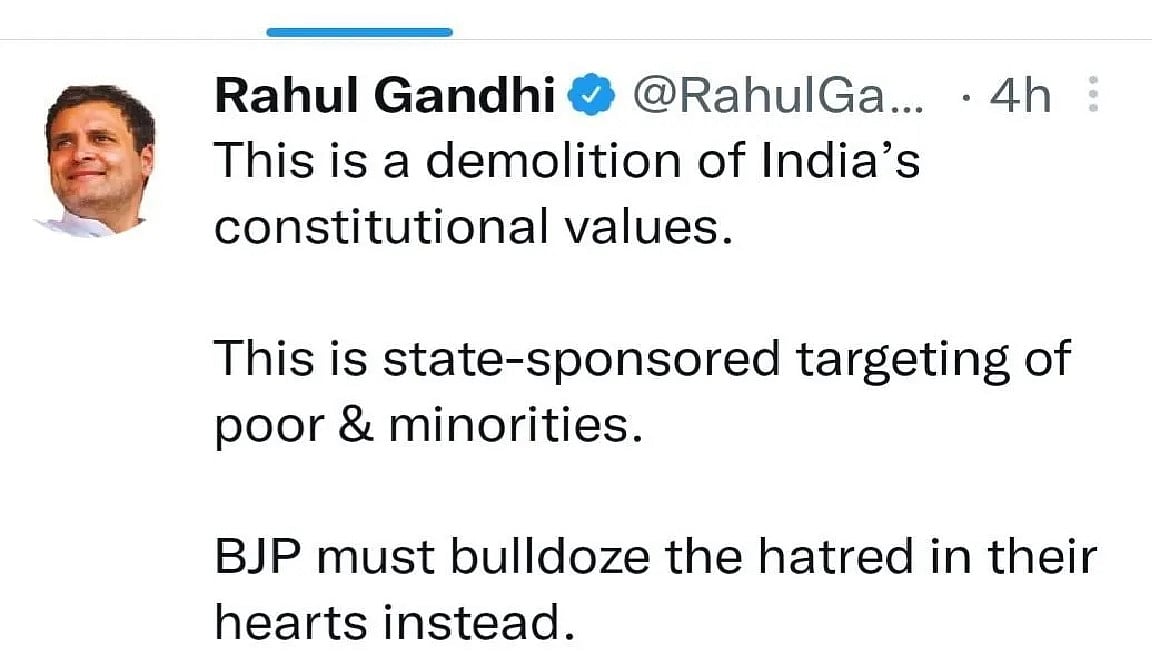 "This is a demolition of India’s constitutional values. This is state-sponsored targeting of poor & minorities. BJP must bulldoze the hatred in their hearts instead, "Congress leader and MP Rahul Gandhi tweeted.