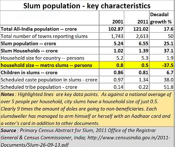 A recent chart that this author carried highlights how absurd the situation has become. In city slums, you find ten times the number of households than justifiable. As against the national norm of around 5 people per household, slums have a household size of 0.5 which is a padding of nine times. This is because almost most slumdwellers have lent their names to at least two families. This is because all benefits to slums – free housing, electricity, gas and water supply and rations – are based on households.