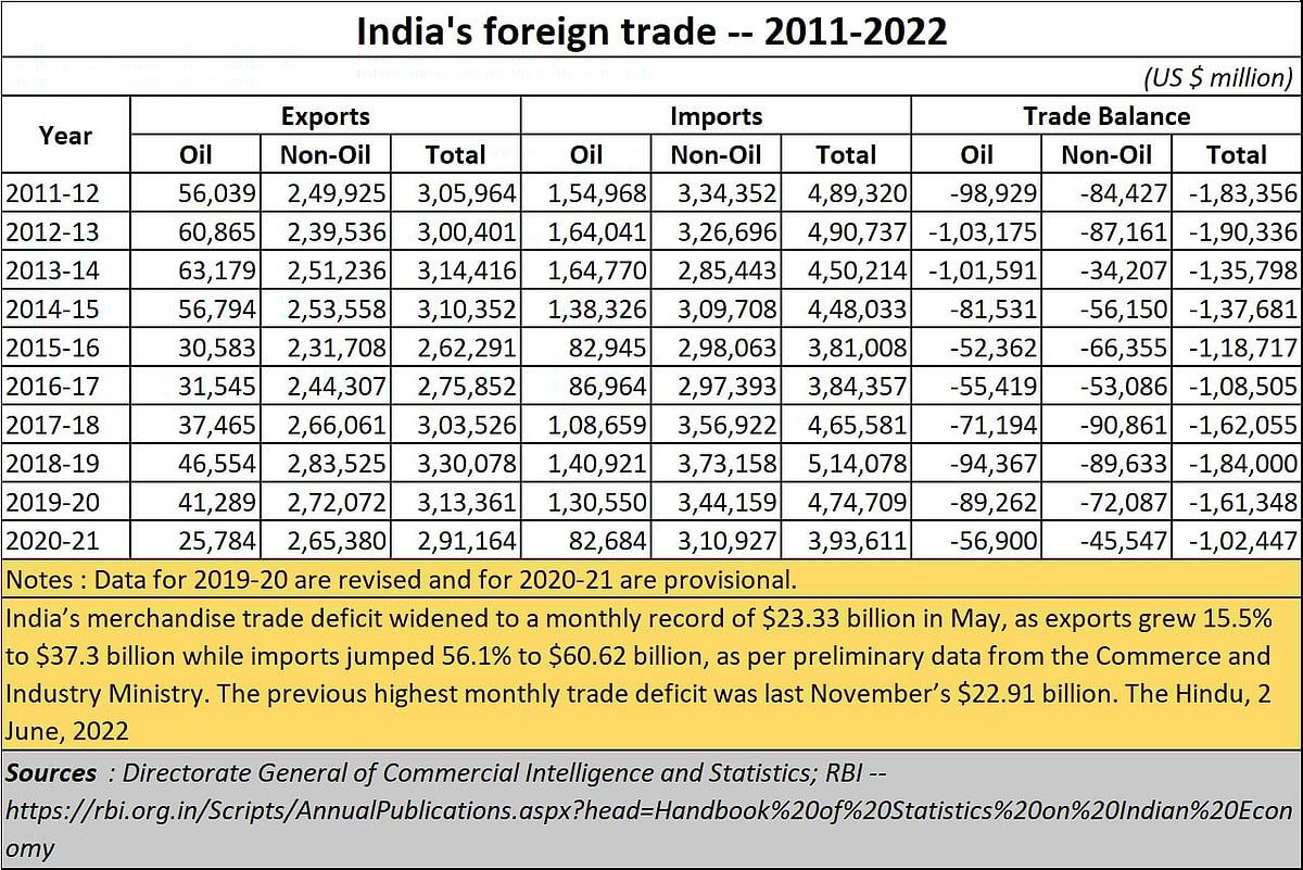 Moreover, as The Hindu pointed out on 2 June 2022, India’s merchandise trade deficit widened to a monthly record of $23.33 billion in May, as exports grew 15.5% to $37.3 billion while imports jumped 56.1% to $60.62 billion. The previous highest monthly trade deficit was last November’s $22.91 billion.