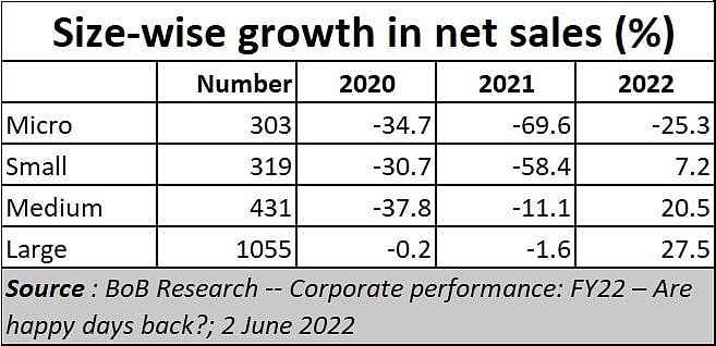 Just look at other sets of numbers. Take corporate performance by the size of the companies, for instance. You will discover that the best growth came from big players. Their sales grew by almost 28%. After two years of negative growth, a 27.5% growth in sales is certainly impressive.