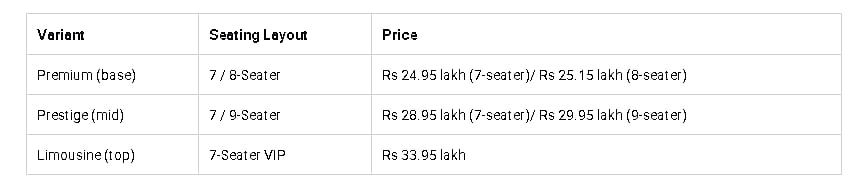 The Carnival is offered in three variants: Premium, Prestige, and Limousine and has a starting price of Rs 24.95 lakh (for the 7-seater Premium variant). The Carnival does not have any direct rivals, but sits sits above the Toyota Innova Crysta and under the Toyota Vellfire and Mercedes-Benz V-Class.