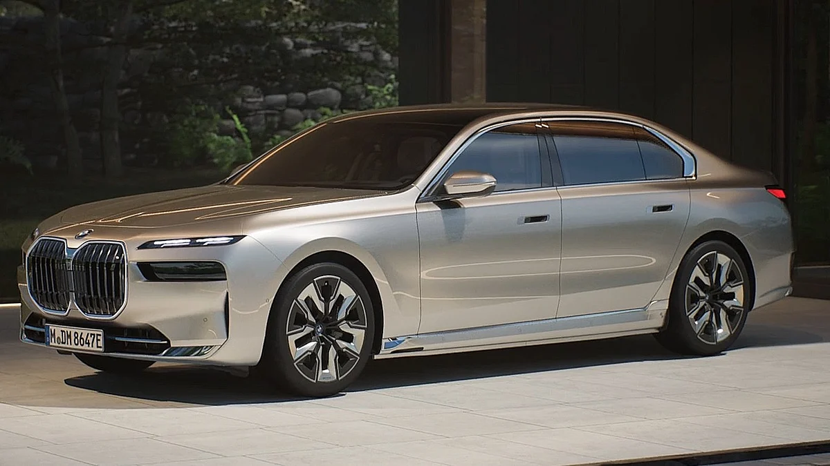 The BMW i7 eDrive50 maintains a similar look to the previous model, with only minor changes like the addition of a spare wheel. Its exterior features include a bold kidney grille, sharp crystal LED headlights, flush door handles, and slim LED tail-lights, along with a two tone paint option. The M Sport variant adds sporty elements like side skirts, special rear view mirrors, and 21-inch M-style wheels.
