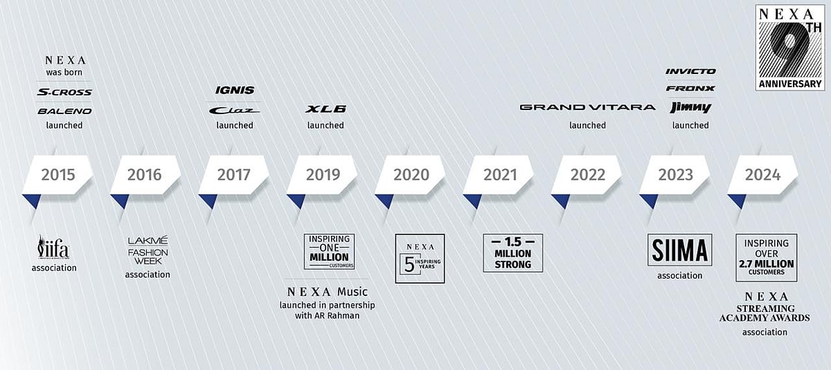Since its inception, NEXA has significantly transformed the Indian automotive retail market by setting new standards in innovation and customer service. This premium retail channel has redefined the car buying and ownership experience, offering unique and innovative experiences through three key pillars: NEXA Music, NEXA Lifestyle, and NEXA Journeys. Through these initiatives, NEXA continues to push the boundaries and provide customers with a distinctive and enriched automotive experience.