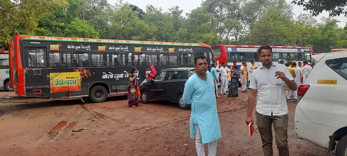 Bhopal city busses were roped in to bring booth workers to the venue.