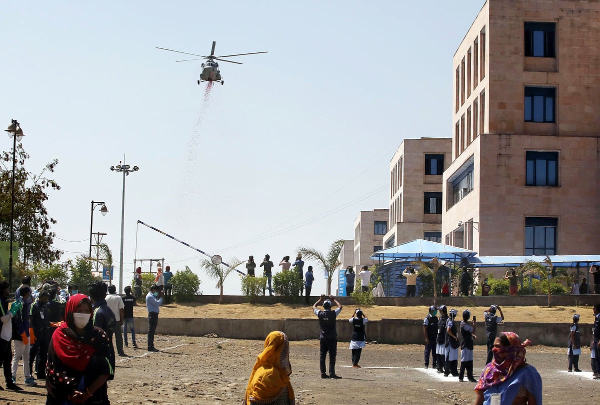 Air Force conducted fly-past and showered flower petals on All India Institutes of Medical Sciences (AIIMS) and Chirayu Hospital as a mark of respect to the corona warriors like doctors and paramedical staff who are fighting corona from front. People were top of the buildings when they came to know about the fly-past of Air Force helicopters.