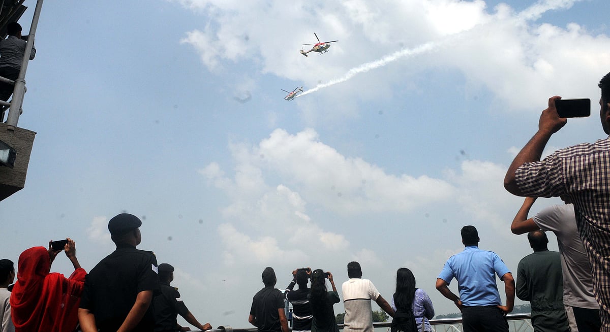 Bhopal (Madhya Pradesh): The skies of the state capital were echoed with the sounds of fighter planes and helicopters. They were getting ready to take part in the upcoming fly past. The planes took off from Rajabhoj Airport and performed acrobatics over the Upper Lake. The planes touched and took off from the runway. People gathered on the rooftops of their houses to see the planes hovering in the sky and captured the thrilling scene in their smartphones and cameras.
