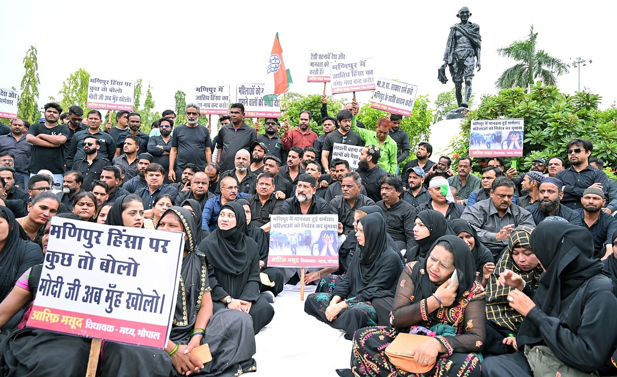 Bhopal (Madhya Pradesh): Congress leaders on Monday staged protest against Manipur violence in the city and alleged that Manipur Chief Minister N Biren Singh was not speaking about the issue. They staged their sit-in wearing black clothes in front of Gandhi statue at Kushabhau Thackeray Convention Centre in the city.
