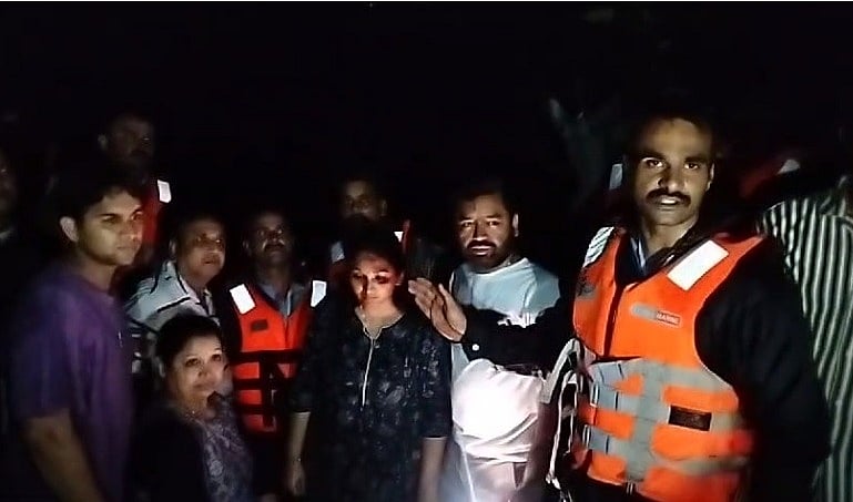 A team from the State Disaster Response Force (SDRF) and the district administration rescued a family around 11 PM. To pull the family with safety, ropes were tied to tractors on both sides, and the family members were brought out through those ropes.