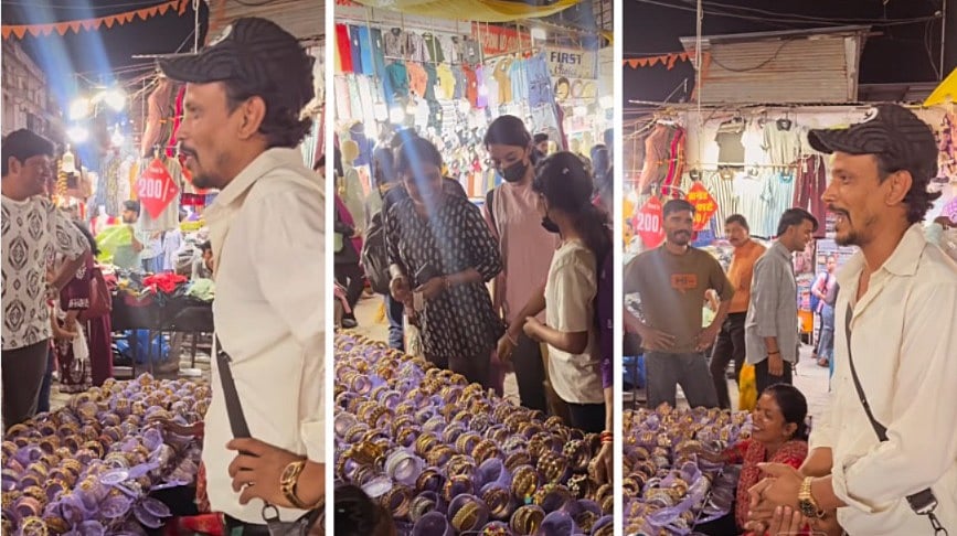 The shopkeeper is seen attracting customers by speaking funny lines and popular reel dialogues while showing different bangles at his stall.