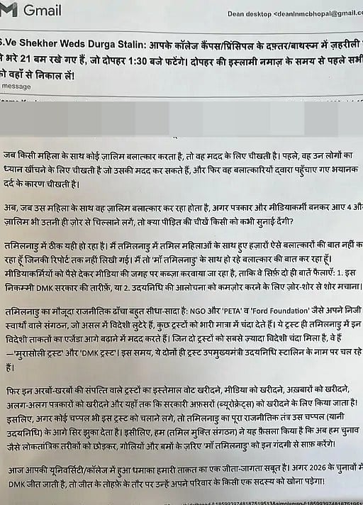 According to information, the dean received the message on the official email ID. The email claimed that cyanide-laced bombs had been placed on campus and warned of an explosion at 12:15 pm, while instructing that doctors and students be evacuated by 11 am.