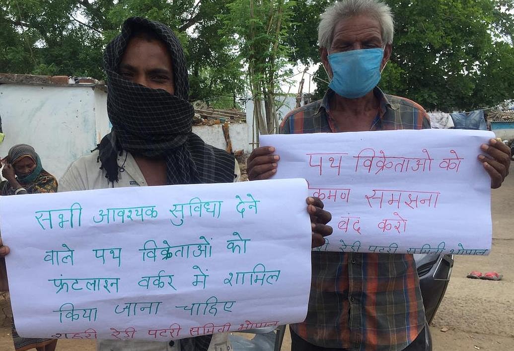 BHOPAL: Members of the ëRehri, Patri Samitií of Bhopal†protested by standing in front of their houses in different places of the city to articulate their demands on WednesdayóPath Vendor Day. They raised their demands through posters. They demanded that, under the Vendors Act, 2014, a†Town Vending Commission (TVC) should be constituted in Bhopal, street vendors should be recognised as frontline workers, a relief package should be announced for them and official identity cards should be issued to them. The samiti and the vendors said that the lockdown had hit their livelihood.