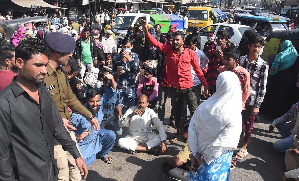 Bhopal (Madhya Pradesh): Dwellers of 1,100 shanties living in three colonies –Ayub Nagar, New Arif Nagar, and Annu Nagar – blocked road along DIG Bungalow on Saturday to protest against railways’ anti-encroachment drive. The drive is on to clear the third track on Bhopal-Indore rail route.