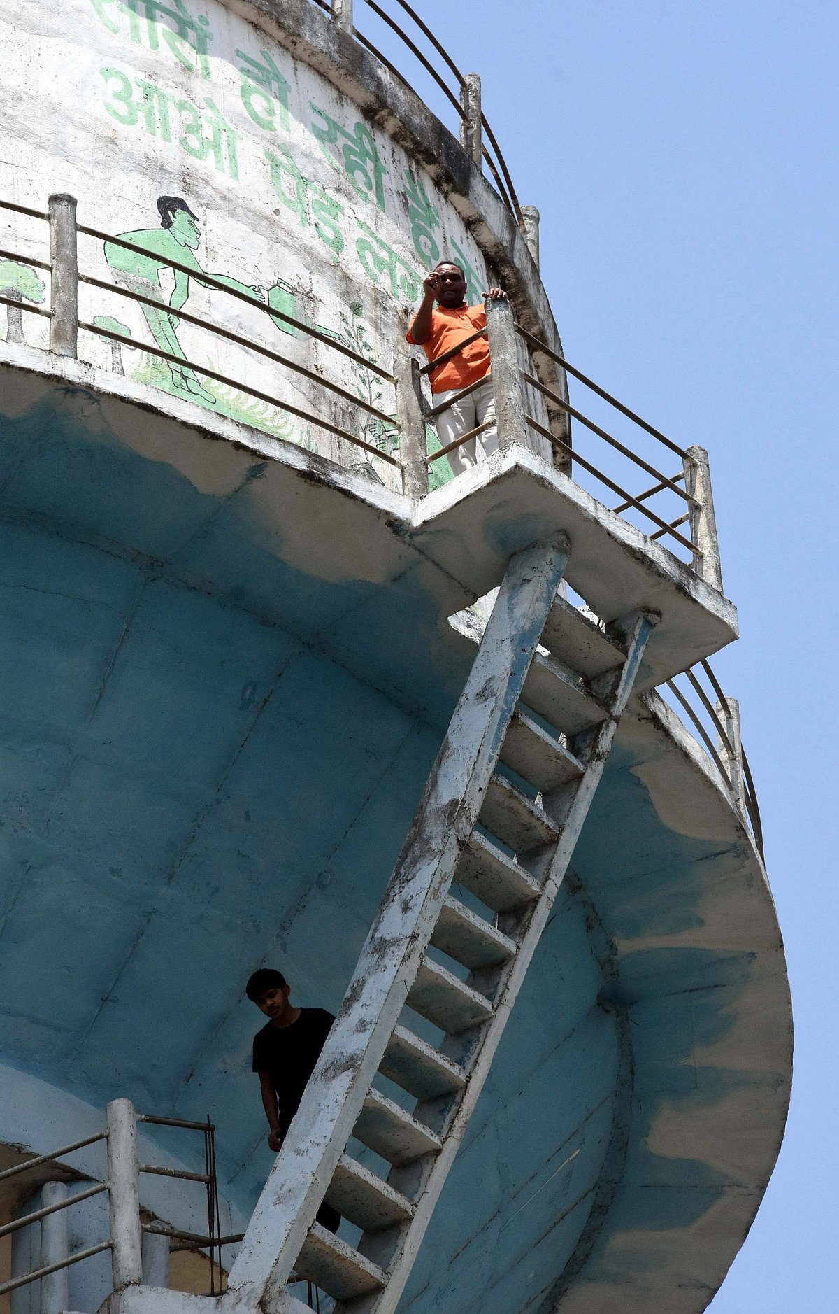 Ritesh Goswami and his son climbed atop overhead water tank once gain to press their their demands in Bhopal on Wednesday. |