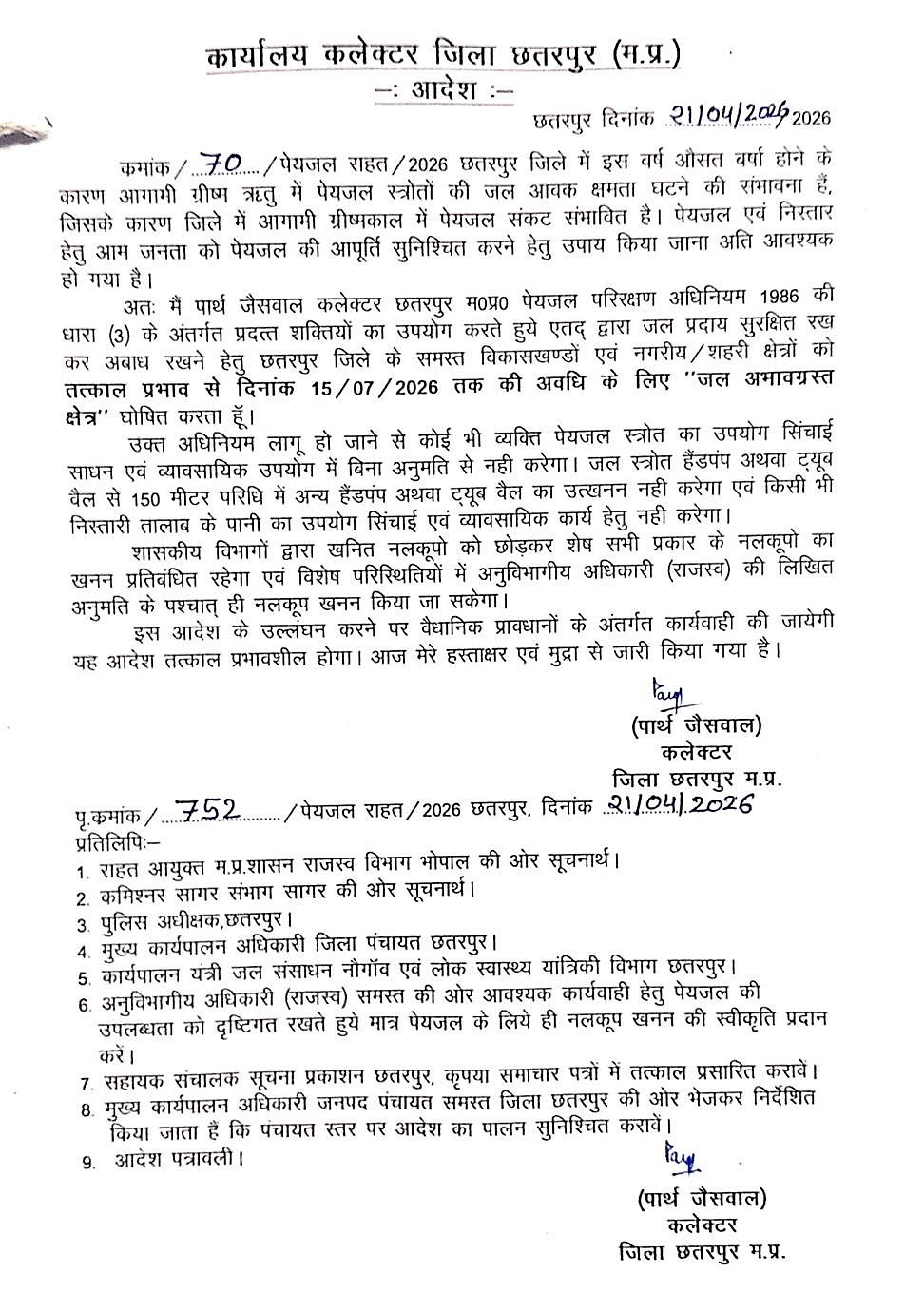 Collector Parth Jaiswal has declared the entire district a water-scarce area until July 15, 2026. The order has been issued under the Madhya Pradesh Drinking Water Conservation Act and has come into effect immediately.