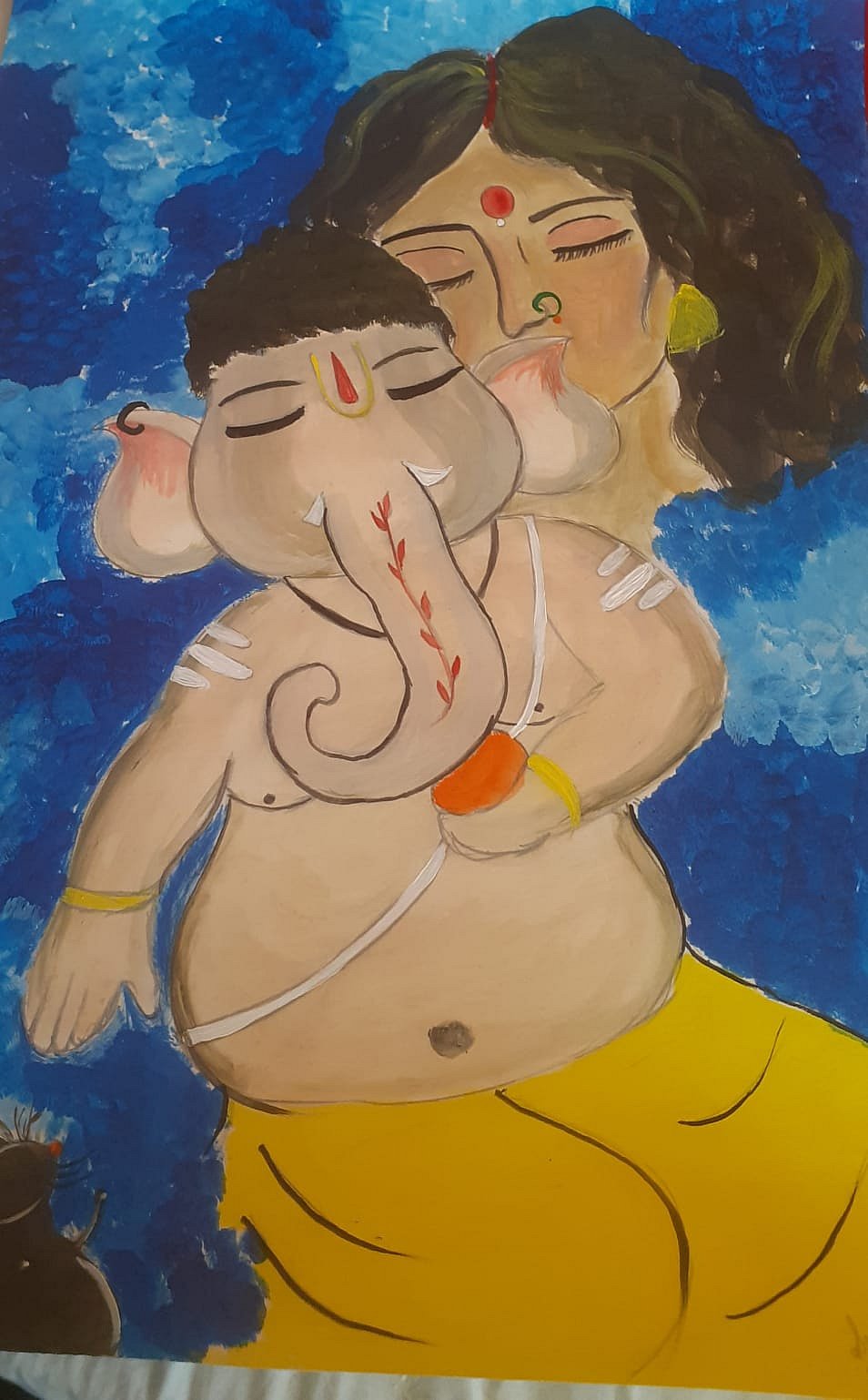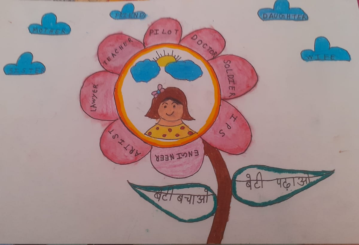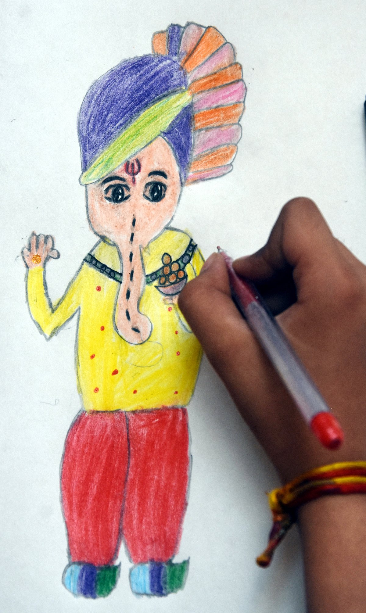 Vartika, a student of Class 3, drew a lady with a hat while Akshita Gore’s painting was themed on Beti Bachao Beti Padhao. In her work, she depicted the different roles women play as friends, mothers, daughters and wives and the career options open to them. They can become engineers, artists, lawyers, teachers, pilots, doctors and soldiers. Surabhi painted child Lord Ganesha with his mother.