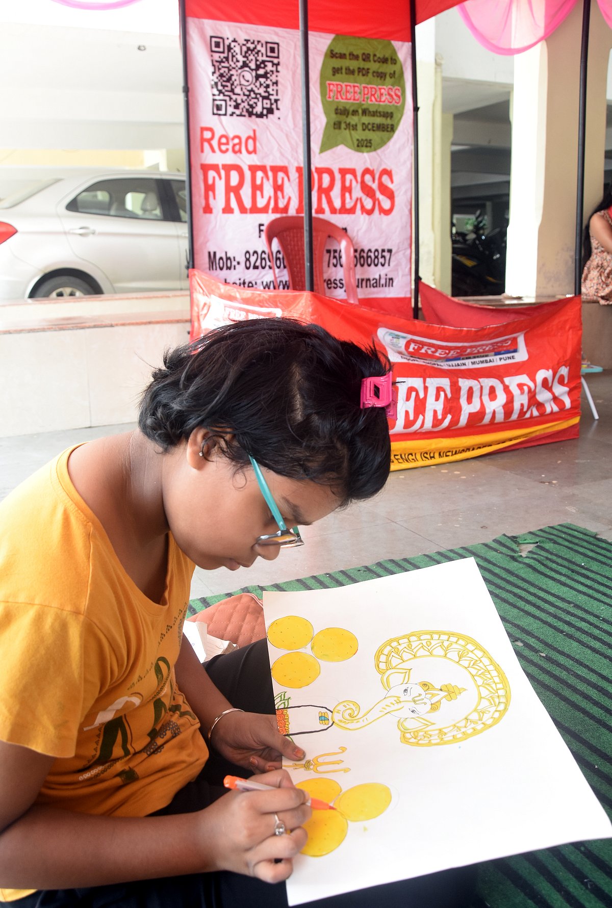 The participants were provided drawing sheets by the Free Press. They brought colouring material, including pastel colours, water colours, crayons and sketch pens, with them. The children were asked to choose their own topics for their paintings. They were given two hours to complete their work. With Ganesh Utsav underway, many of the children chose to theme their paintings on Lord Ganesha.