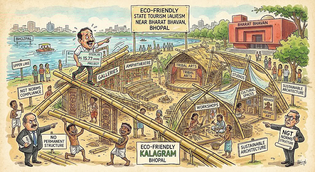 According to MPSTDC official, Kalagram will have no permanent structure in keeping with NGT norms for no-construction zones around Upper Lake, a Ramsar site. Reinforced concrete cement work will be limited to the plinth level and all the structures above the ground would be temporary and made of bamboo with an iron frame.