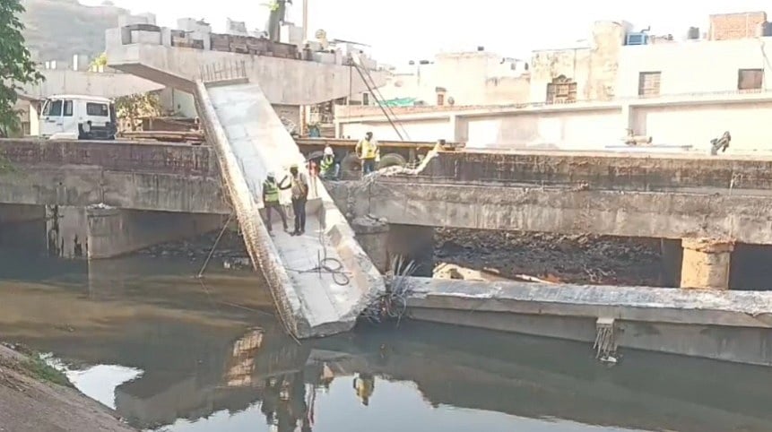 The incident took place near Khedapati Temple in the Khedapati Colony area. According to officials, a 35-foot long cement girder was being placed on the elevated road when it suddenly lost balance and fell into a nearby drain.
