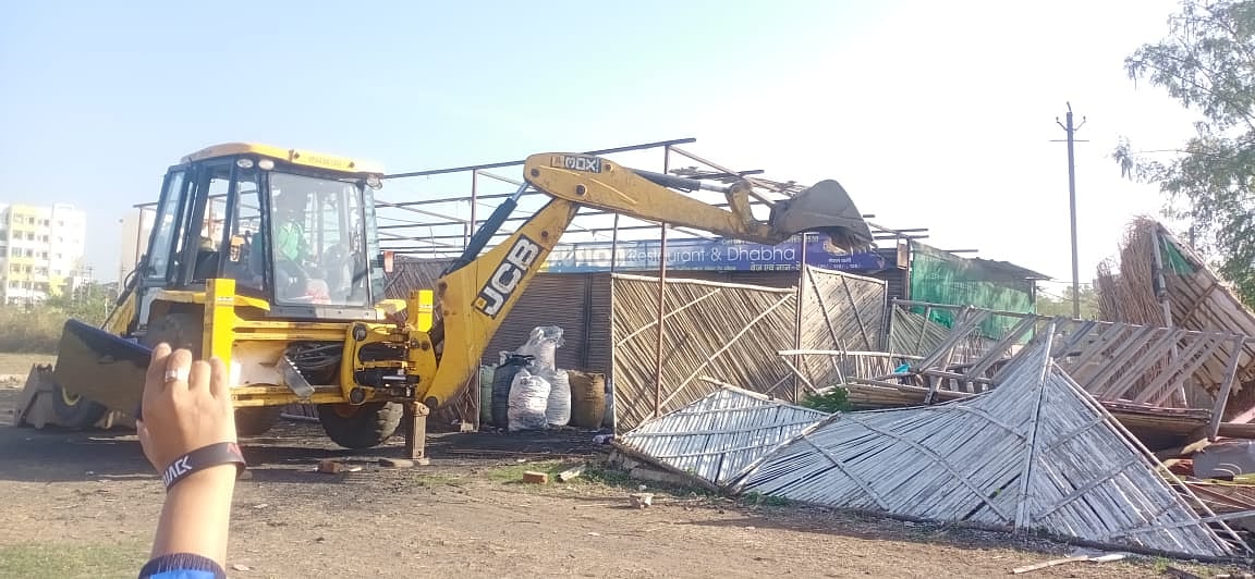 Bhopal: Amidst police security, a team of district administration and Bhopal Municipal Corporation razed illegal structures raised by land mafia, Suneel Yadav in Kolar on Tuesday. The teams bulldozed dhaba, shops and workshop spread in an area of one acre.