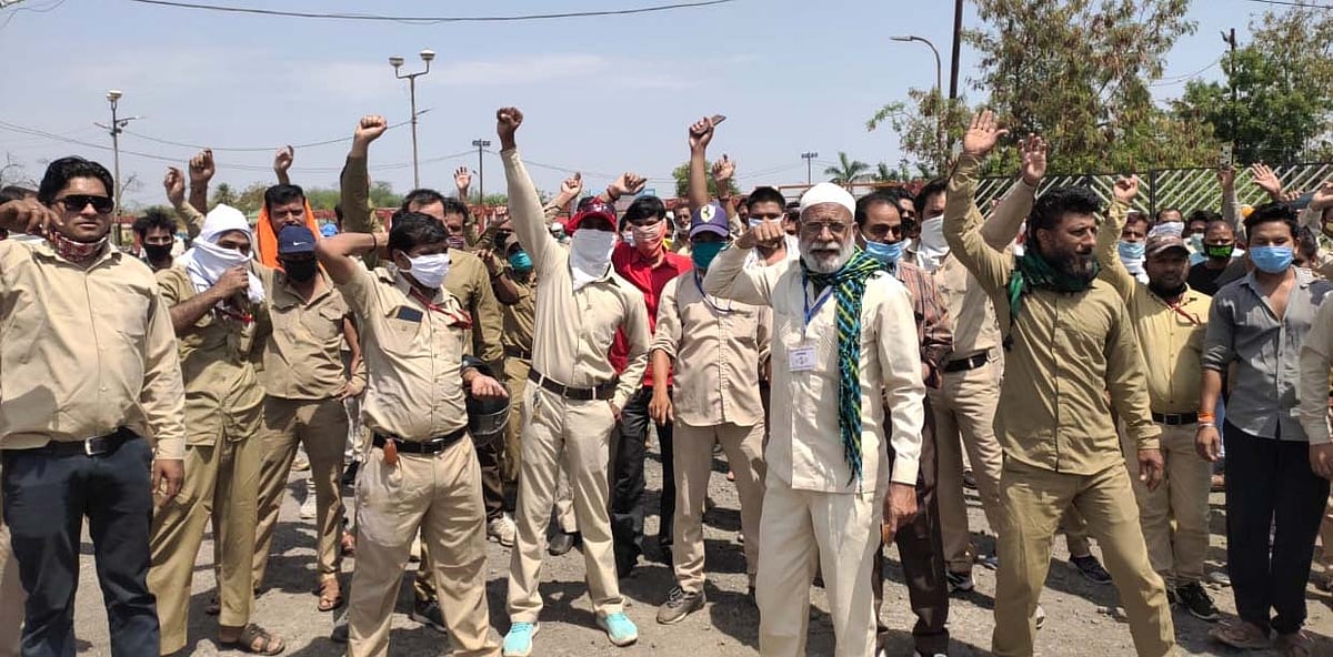 Overlooking lockdown guidelines, drivers and staff of the buses owned by Bhopal City Link Limited (BCLL) stage a protest seeking salaries on Monday. Not being given salaries for over ‘two months’, the BCLL staffers held a protest at Baiaragarh depot.