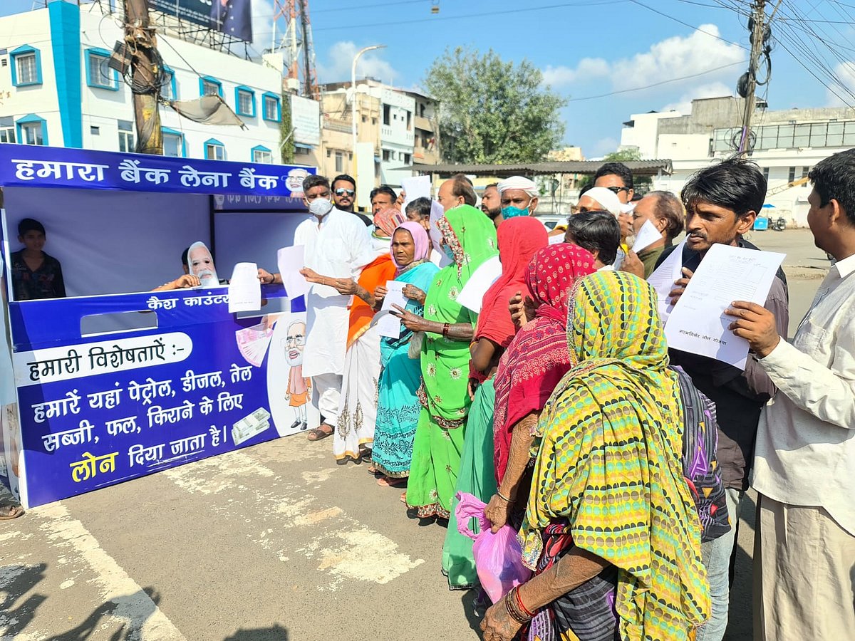 Bhopal (Madhya Pradesh): Congress has set up ‘Lena Bank’ in Bhopal to lodge their protest against rising inflation in the country.