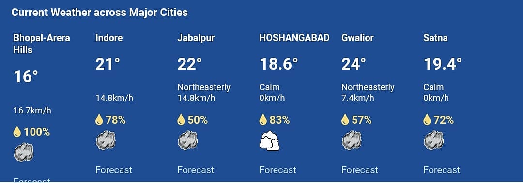 Bhopal recorded a drop of 5.0°C in day temperature to 26.4°C, while night temperature fell by 1.2°C to 14.4°C. Similarly, Indore saw a drop of 2.6°C in day temperature to 28.6°C, with night temperature decreasing by 1.2°C to 15.2°C.