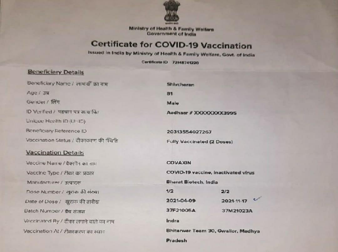 Notably, one 81-year-old Shivcharan Pathak died on 10 May 2021 due to gangrene in Bhitarwar, Gwalior. His death certificate was also received. On November 17, his son Vinod received a SMS saying that Shivcharan Pathak's vaccination has been completed, you can download the certificate. Vinod was surprised to see this as he himself is an employee in the Health Department.