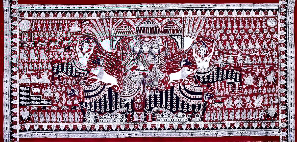 One of the unique features of these paintings is the formation of four to five pieces of these hangings to form a shrine for the goddess. The nomadic community uses these hangings to portray the epic of the mother goddess and establish a temporary shrine for her.