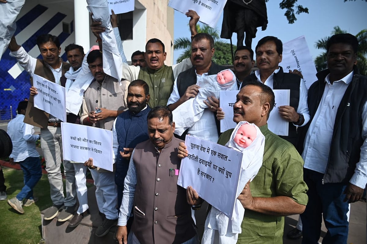 Another MLA carried a cough syrup bottle, and several leaders held dolls to highlight the deaths of children in the state.