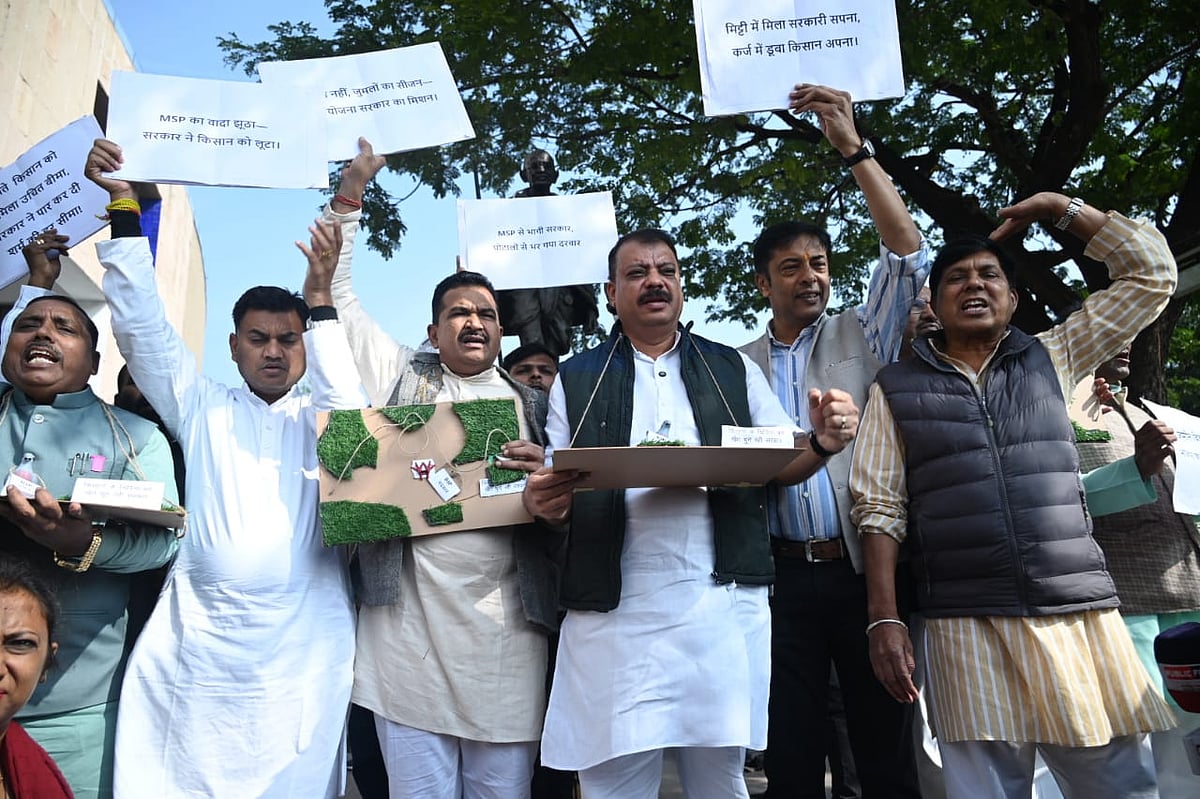 Before the proceedings began, the MLAs arrived carrying placards showing damaged crops and brought a symbolic display titled “Chidiya Chug Gayi Khet” to show the poor condition of farmers’ fields.