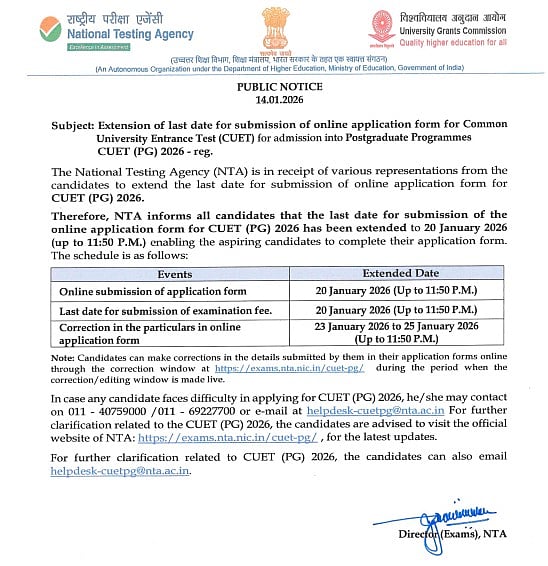 According to the official notice, candidates can now submit their CUET (PG) 2026 application form and pay the examination fee till January 20, 2026, up to 11:50 pm.