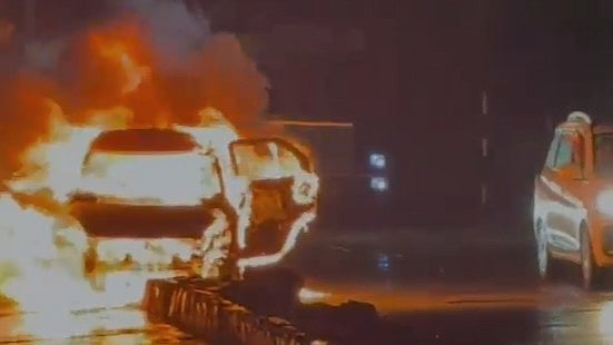 A video of the incident has surfaced, showing the car fully engulfed in fire, while other vehicles pass by.
