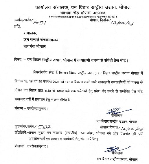The notice has been issued by the Office of the Director, Van Vihar National Park, Bhadbhada Road, Bhopal.
