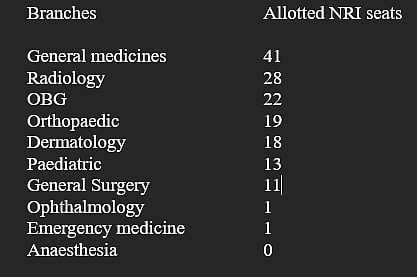 These branches are dermatology, general medicine, general surgery, gynaecology (OBG), orthopaedics, paediatrics, radiology, ophthalmology, anaesthesia and emergency medicine. Out of these 10 breaches, three branches: ophthalmology, anaesthesia and Emergency medicines gets negligible response in NRI quota. Most of the NRI quota has been given for high-demand branches such as radiology, dermatology, orthopaedics, OBG, general medicine and paediatrics.