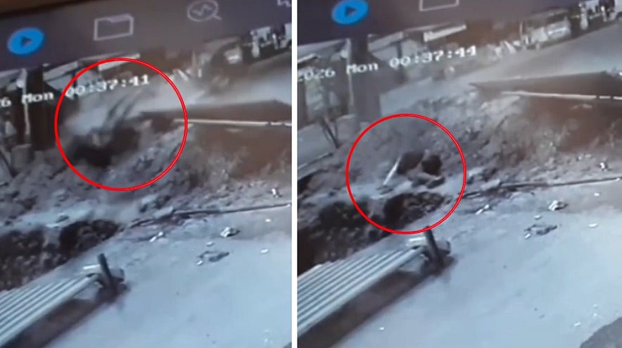 In the CCTV clip, the motorcycle can be seen coming at high speed, as if the riders were unaware of the roadwork ahead. They failed to apply the brakes in time and crashed into the tin barricade placed near the site. Due to the impact, one rider was thrown to the side of the road while the other fell into the dug pit. The motorcycle remained on the road after the crash.