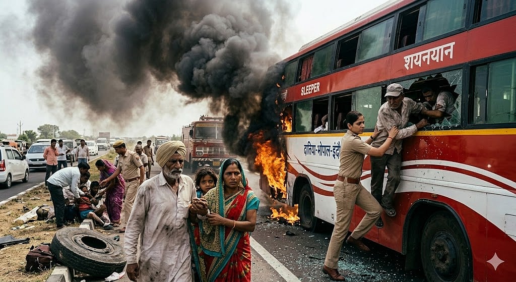 After this, as soon as the bus reached in front of Jhansi Road police station, the tyre of the bus burst with a loud noise and suddenly it caught fire.