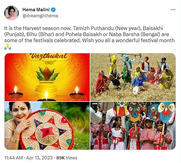 "It is the Harvest season now. Tamizh Puthandu (New year), Baisakhi (Punjab), Bihu (Bihar) and Pohela Baisakh or Naba Barsha (Bengal) are some of the festivals celebrated. Wish you all a wonderful festival month," Hema Malini tweeted.