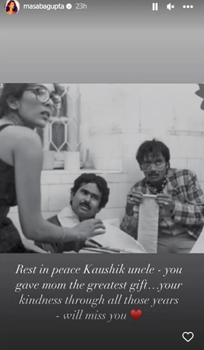 Before that Masaba took to her Instagram story to shared another throwback picture of her mother with Satish Kaushik and wrote, "Rest in peace, Kaushik uncle. You gave mom the greatest gift... Your kindness through all those years - we will miss you."